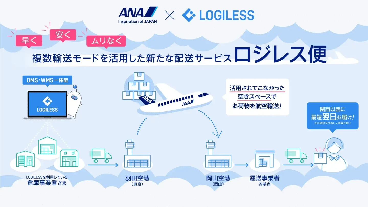 「空輸は高い」という印象を持っている方は多いと思いますが、ANAとの連携によって従来より安い送料で配送することが可能になりました。 ロジレス便を活用することで、従来より送料を20%削減*することも可能です。